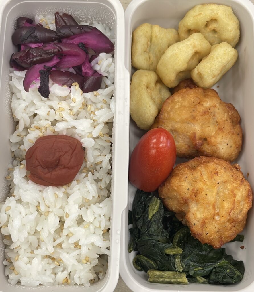 おかずはアンパンマンポテト、塩唐揚げ、トマト、ほうれん草