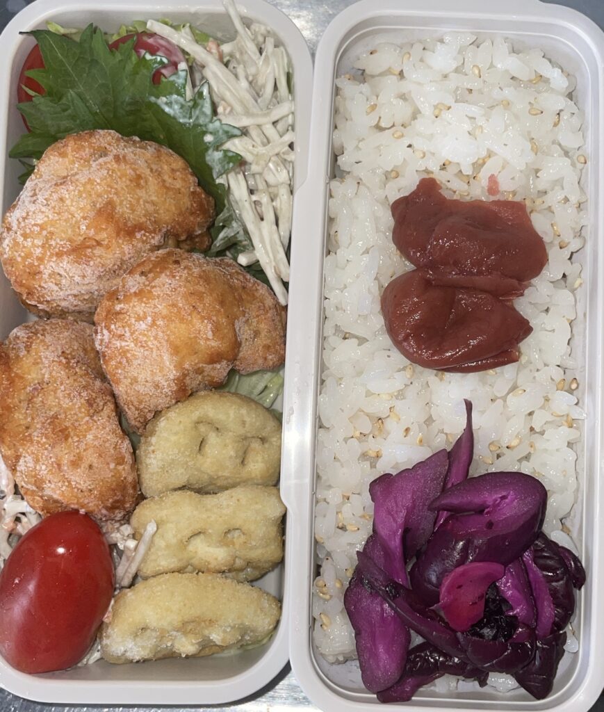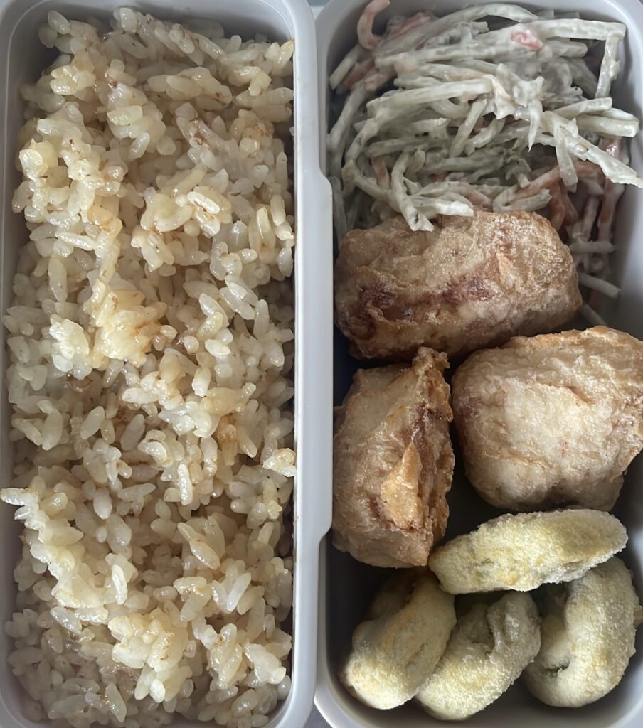 ごぼうサラダ、塩唐揚げ、アンパンマンポテト。