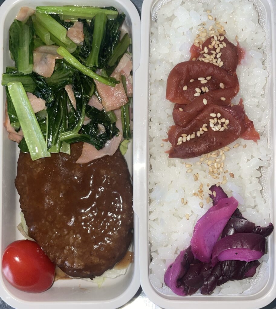 ベーコンとほうれん草のバター炒め、ハンバーグ、トマト。